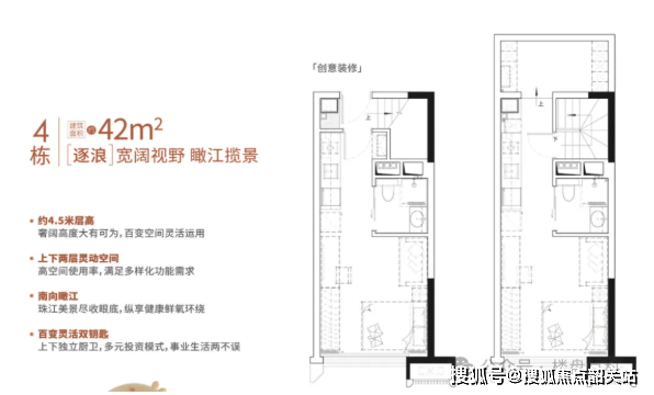 户型涵盖30㎡、42㎡、60㎡、84㎡等多种面积段,朝向包括东南、西南、东北、西北,满足不同采光与景观偏好。特别推出双钥匙户型与复式中空设计,一套可作两户使用,租金收益翻倍;复式结构则提升空间层次感,居住体验更佳。