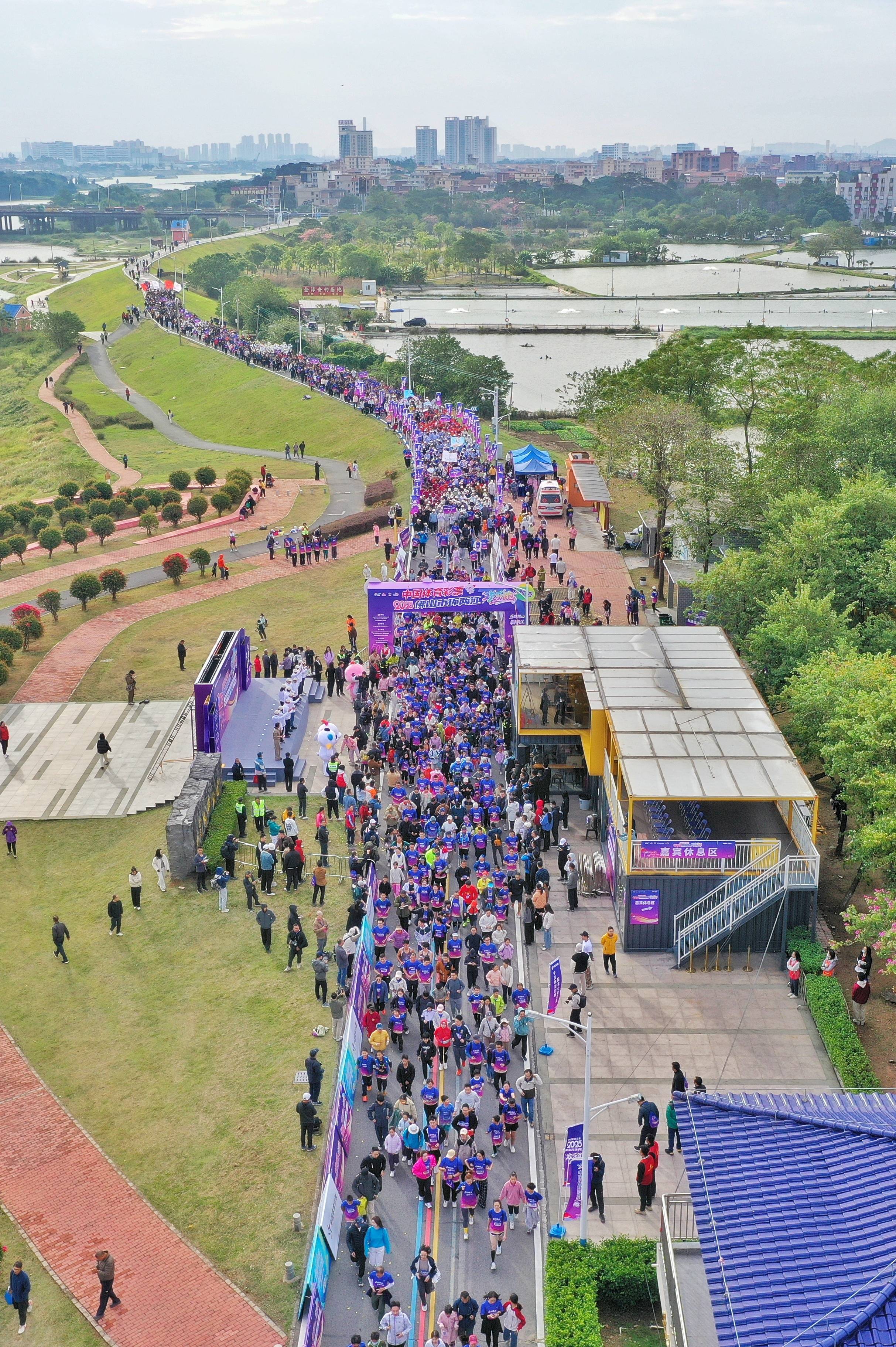 活动采用折返跑的形式,跑道以南海金沙岛国家湿地公园为起始点和终点,沿途串联起沿江绿道、广东万里碧道的核心景观段落,形成一条“江景+绿道+湿地”的生态跑道。