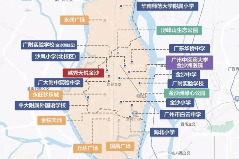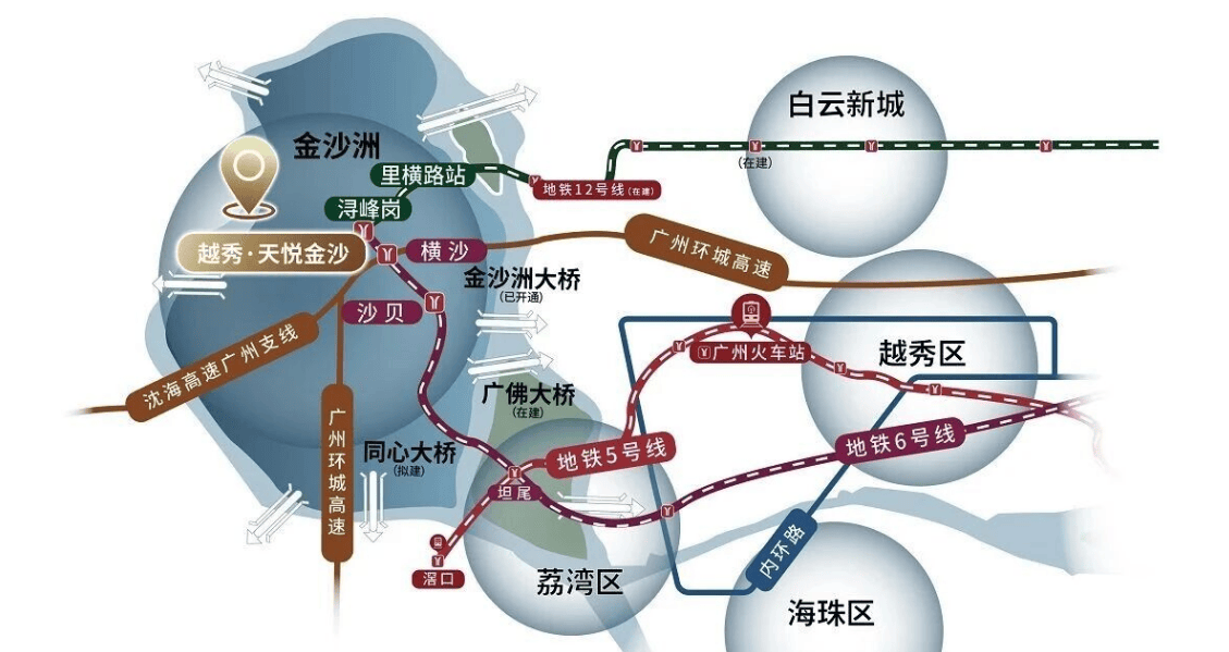 越秀天悦金沙落位白云区金沙洲浔峰山东路,正处广佛同城的核心融合区,这里既是白云区的西部门户,也是佛山南海对接广州的重要枢纽,凭借成熟的交通路网,轻松实现 “广佛双城生活圈” 的自由切换,不管是日常通勤还是周末出行,都能兼顾便捷与灵活。