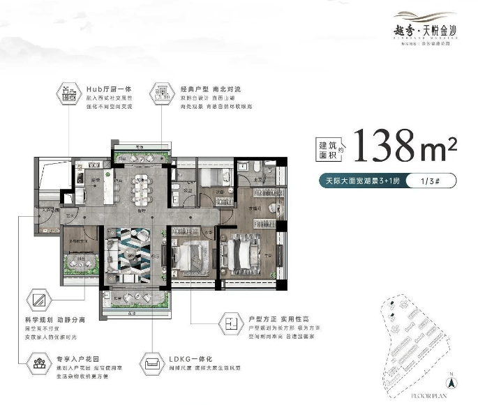 3 梯 6 户配置,出行便捷不拥挤,总价 270 万起,性价比超高。这款户型主要分布在 33 层以上,视野开阔,部分户型可远眺湖山景致,推窗就能看到浔峰山与湖泊的美景。户型布局紧凑,空间利用率高,动静分区合理,客厅朝南,卧室带飘窗,满足日常居住的所有需求。对于想在金沙洲置业,追求高性价比的刚改家庭来说,这款户型是不错的选择。