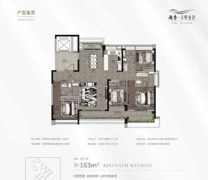 南向三开间搭配 6.85 米阔景阳台,采光通风效果一流,270°L 型观景阳台直面山湖,坐在阳台上就能欣赏到湖山相连的美景,视野无敌。这款户型空间宽敞,可打造为四房或五房,满足多孩家庭或三代同堂的居住需求,每个房间都有充足的空间,孩子有自己的玩耍天地,老人有独立的休息空间,一家人各得其所。动静分区合理,客厅、餐厅的公共区域与卧室的私密区域相互分离,保证了居住的舒适度。