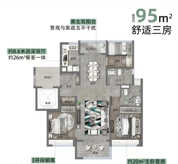 这款户型是 2 梯 2 户板式设计,南北通透,通风采光效果极佳,双阳台设计巧妙区分生活与景观,生活阳台用来晾晒、储物,景观阳台用来欣赏湖山美景,实用性与观赏性兼备。三开间朝南,南向面宽近 10 米,让客厅、两个卧室都能享受到充足的阳光,卧室飘窗全赠送,进一步提升了空间利用率。对于新婚夫妇或年轻小家庭来说,这款户型空间适中、布局合理,总价友好,是刚需首套的优质选择。