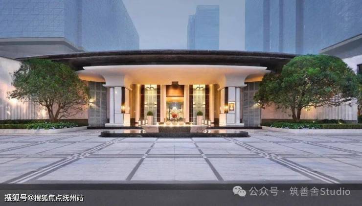 下沉庭院以约6.15米高的悬挑水帘、水中下沉卡座,构筑行走于水上的通行体验,与地下配套用房对话。地上地下的双园驱动,以直径约2.5米的雅典黑金花水钵为起点,以直径约2米的黄金麻整石水钵为终点,通过金澜线条的延续,串联景观故事线,回应湖映金沙的营销价值。