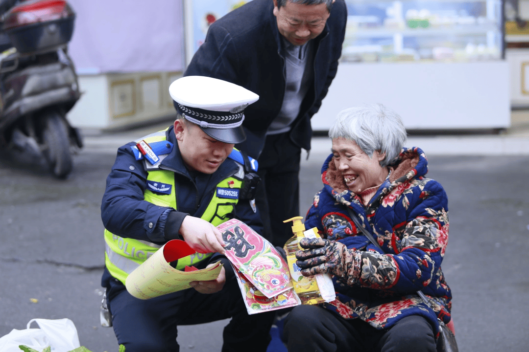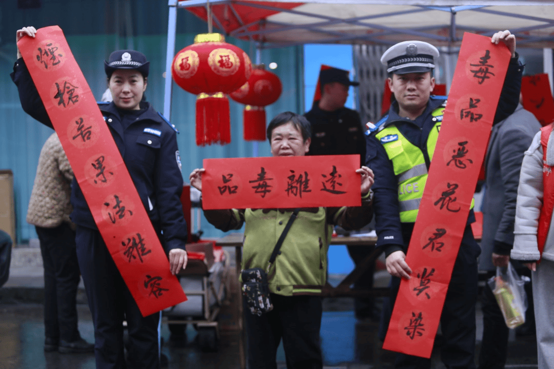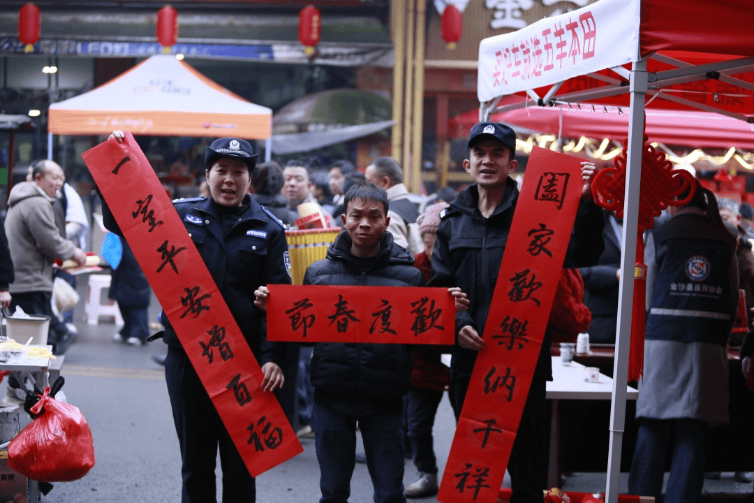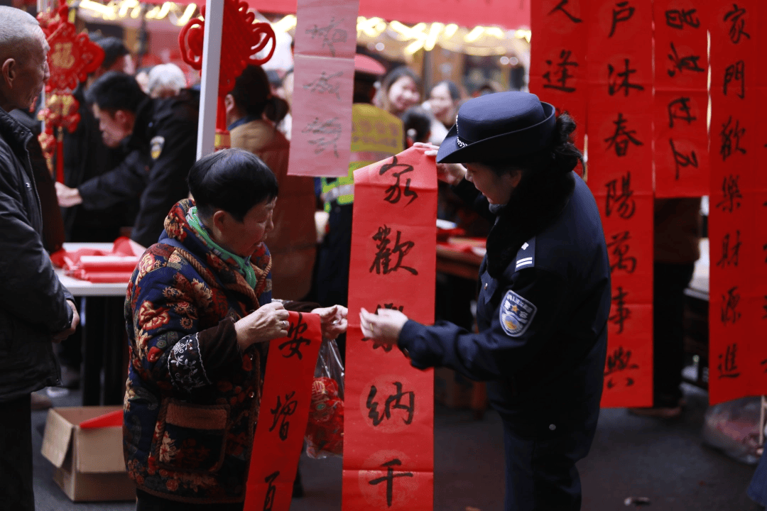 集市中央的“平安摊位”布置得年味十足,笔墨红纸铺陈桌面,小马窗花、平安结、红灯笼等年饰堆得满满当当。反诈队员现场挥毫泼墨,免费为赶集乡亲书写“出入平安”“家和福满门”等春联,墨香与烟火气交织,引得众人围聚等候。一副春联刚晾干,便被乡亲小心收进背篓,队员还顺手将一枚精致的平安结放进一位赶集大娘的背篓,笑着叮嘱:“阿姨,这个挂家里,好看又保平安!”朴实的祝福与乡亲的欢笑,为集市更添暖意。