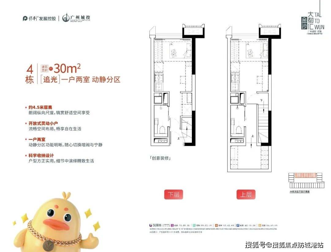 保利金沙大都汇户型以小面积复式为主,建筑面积30-42㎡,层高约4.5米,采用双钥匙管理模式,上下两层独立入户,可同时自住与出租,实现投资收益与居住便利兼得。户型布局科学,客厅、卧室及厨房区域分隔合理,空间利用率高,满足单身、情侣或小家庭居住需求。