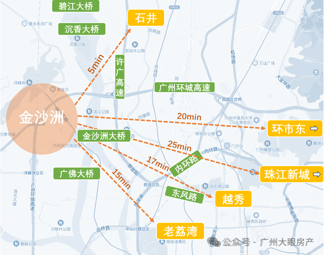 金沙洲的区位,其实都还行,横跨广州白云区和佛山南海区,临近荔湾,和广州的主城区相隔不远,尤其是广钢新城、白鹅潭、白云新城这些,对于不少人来看,这样的距离,是符合通勤距离的。