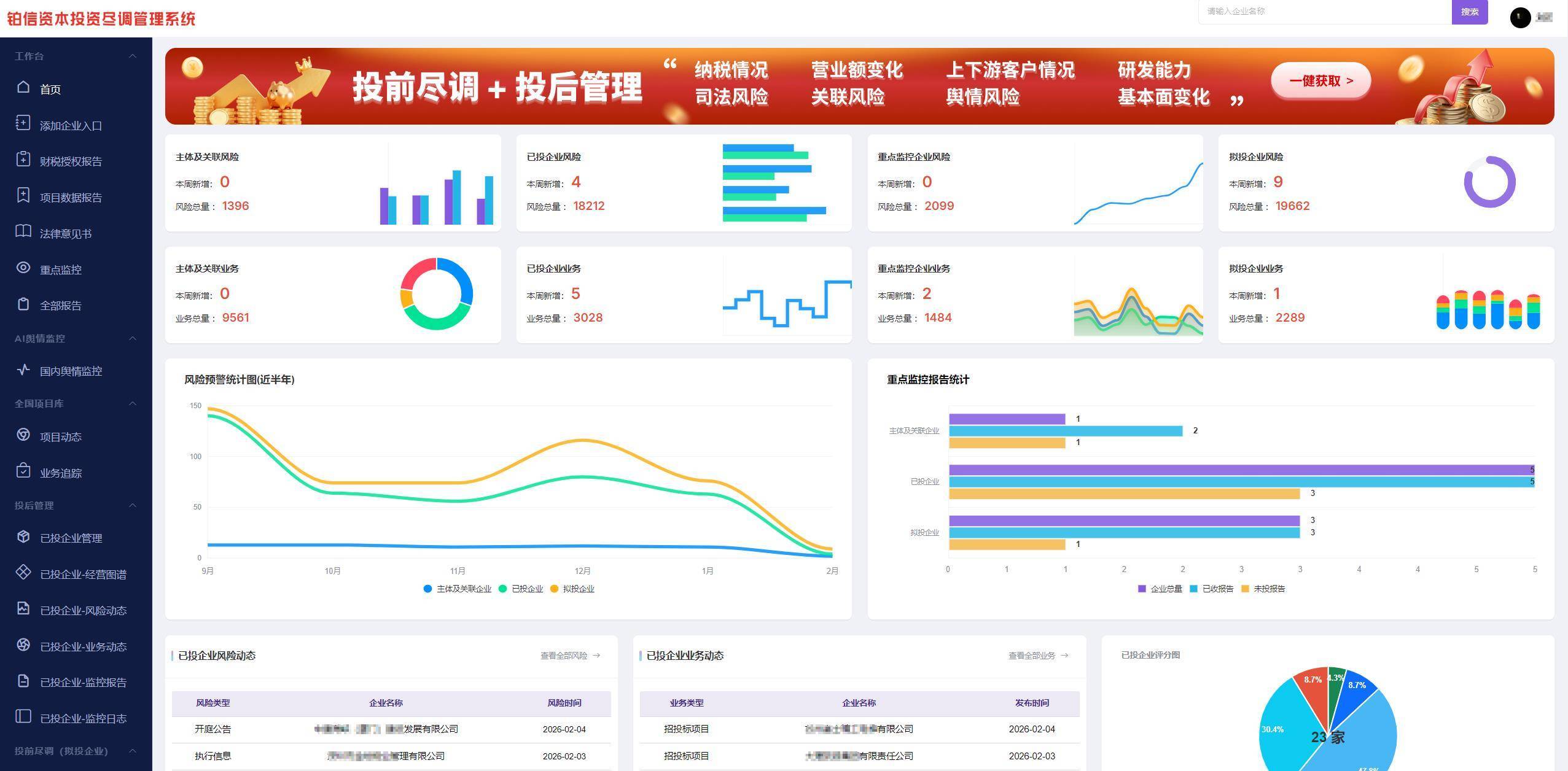 系统发票统计模块,涵盖开票营收、成本支出等信息,助力金融机构分析企业经营真实现金流,识别过度依赖与垫资黑洞,及时发现供应链断裂和隐性债务;风险动态模块可查看企业法院公告、限高、失信等活性信息,实时感知账户冻结、资产查封等风险;舆情模块能及时捕捉负面舆情,推动机构从被动催收转向主动保全,避免风险恶化。