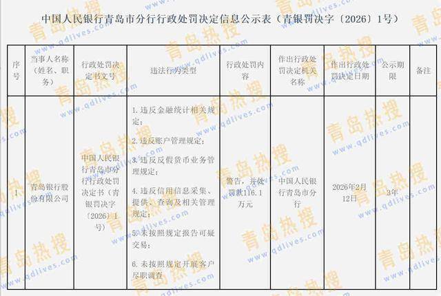 2026-02-21金沙娱乐,金沙娱乐城官网,金沙娱乐城app,金沙娱乐城,金沙集团官网,金沙娱乐城注册,金沙官网,金沙app,澳门金沙娱乐城官网,金沙网站,金沙官网,金沙集团,澳门金沙官网,澳门金沙网站,澳门金沙注册青岛热搜网获悉,2月12日中国人民银行青岛市分行对青岛银行股份有限公司作出行政处罚决定(青银罚决字〔2026〕1号)。
