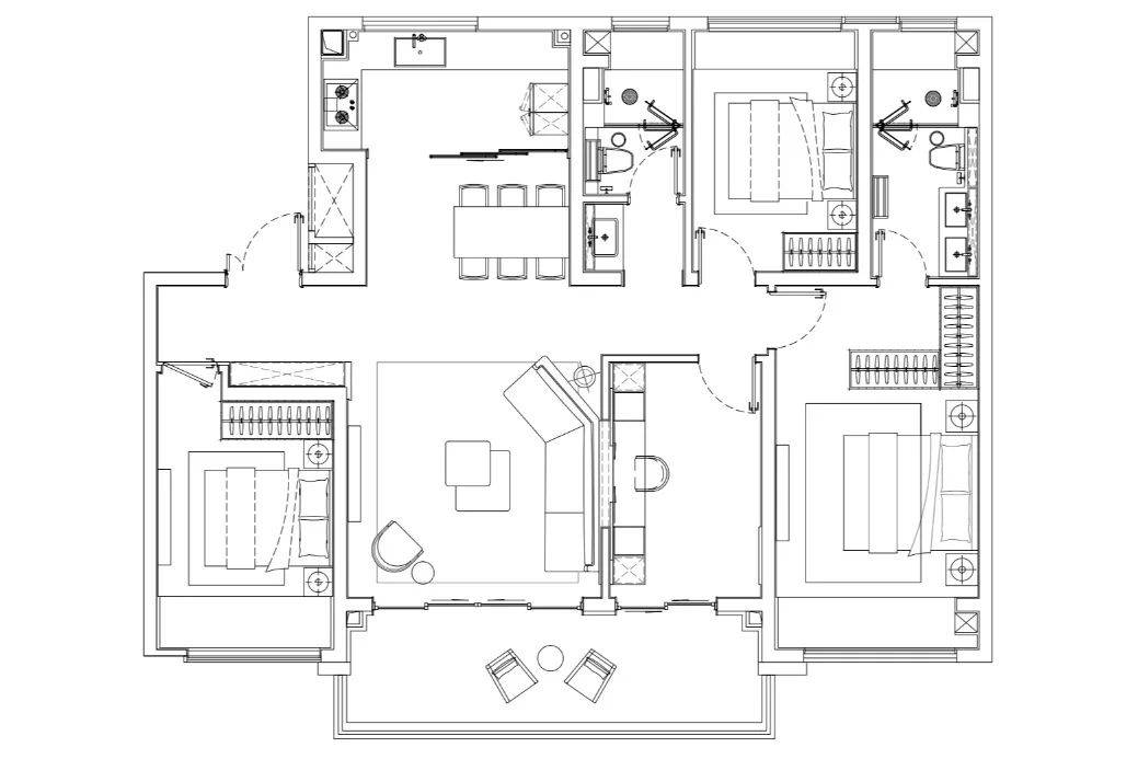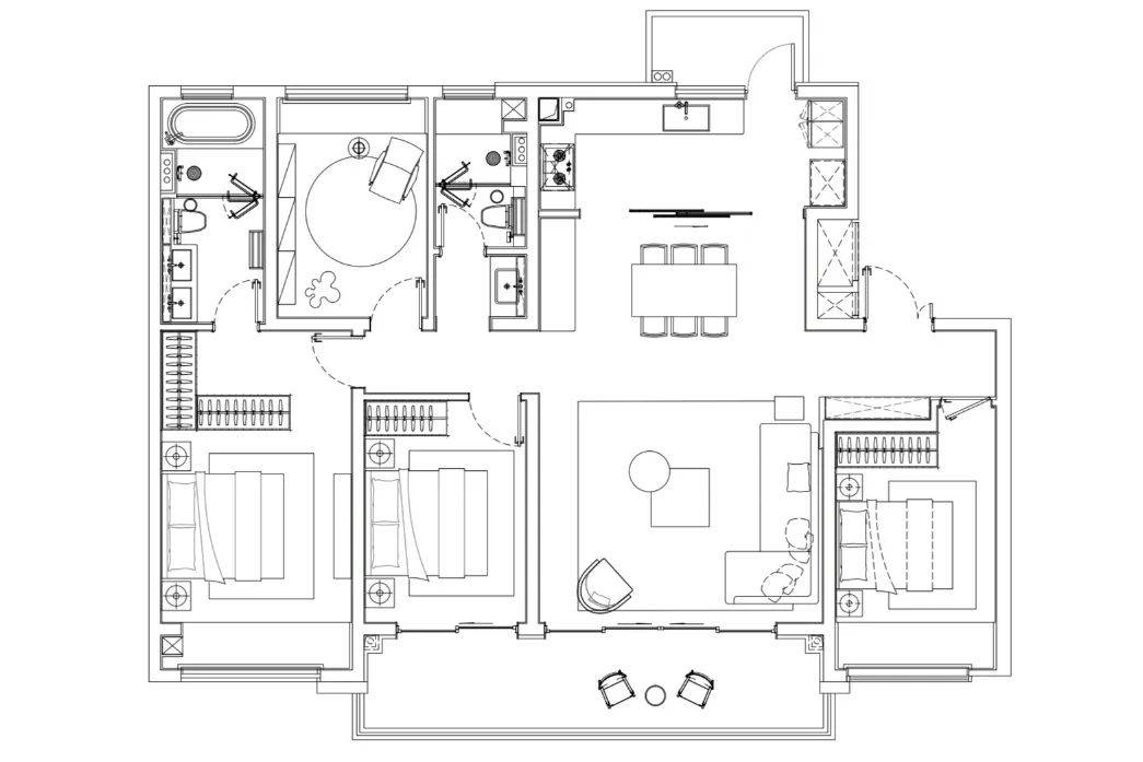 【心悦】130㎡:三个卧室都朝南,客厅、餐厅、厨房、阳台一体化设计,空间非常通透。同样是约2米进深的大阳台,还能多隔出一个灵活房间,满足更多需求,非常适合改善家庭。