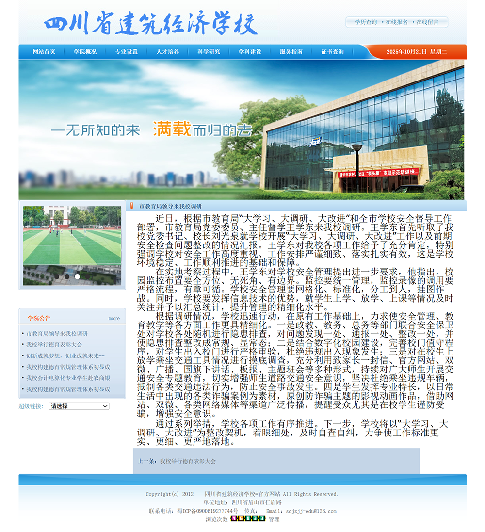 澎湃新闻注意到,上述网站发布的信息有明显拼接痕迹。例如,“四川省建筑经济学校”网站发布的《市教育局领导来我校调研》一文声称,近日,根据市教育局“大学习、大调研、大改进”和全市学校安全督导工作部署,市教育局党委委员、主任督学王学东来我校调研。王学东首先听取了我校党委书记、校长刘光泉就学校开展“大学习、大调研、大改进”工作以及前期安全检查问题整改的情况汇报。